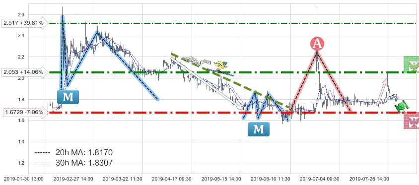 ♘ 阻力价格位2.053,可信任强度77.75%,距离最后交易2019-07-31 15:00形成的收盘价格1.8000相差 +14.06%