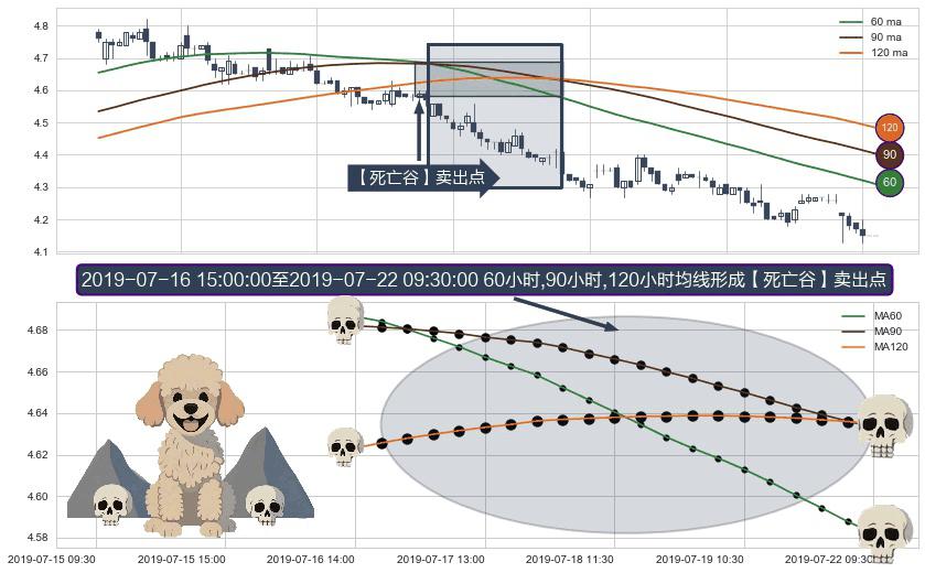 形态多维评估: ⚀ 2019-07-17 09:30:00-小时至2019-07-22 09:30:00-小时显现 60小时-90小时-120小时均线 【死亡谷】卖出点 看空信号,后市看跌,卖出