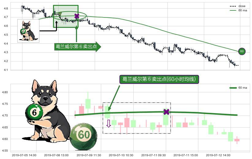形态多维评估: ⚀ 2019-07-09 13:00:00-小时显现 葛兰威尔均线 60小时均线 第⑥卖出点 走势反转见顶信号,后市看跌,卖出信号