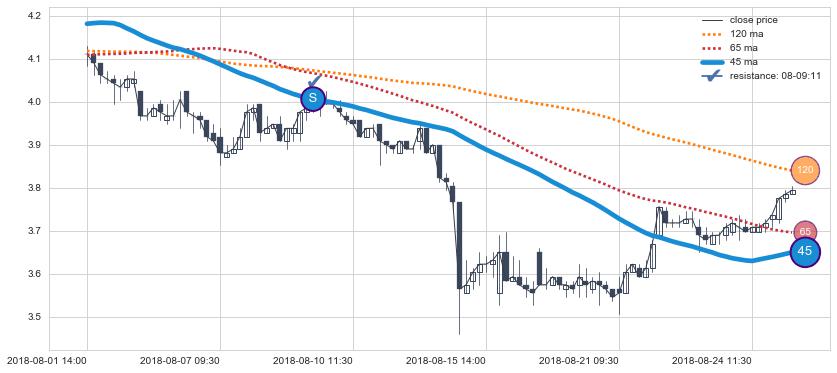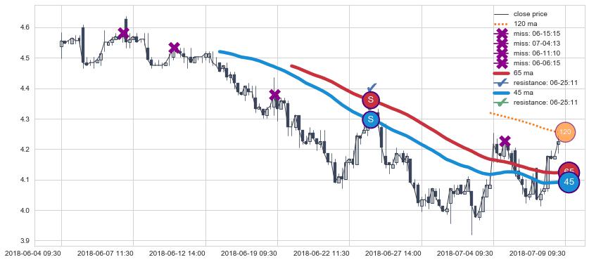 下跌趋势06-04 09:30-07-09 09:30,均线65, 45确认关键阻力1处