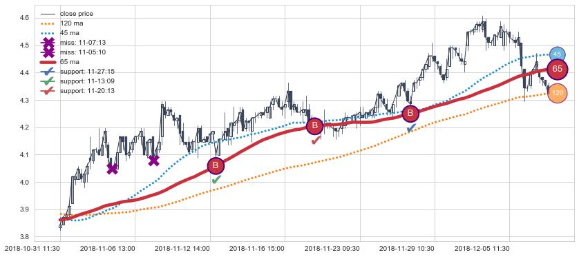 上涨趋势10-31 11:30-12-07 13:00,均线65确认关键支撑3处