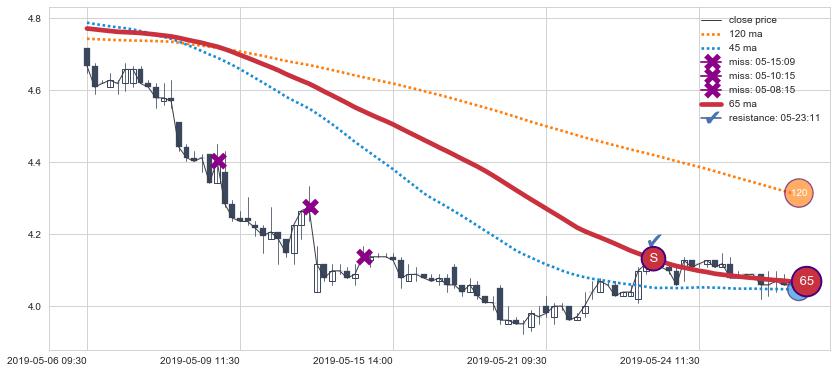下跌趋势05-06 09:30-05-28 11:30,均线65确认关键阻力1处