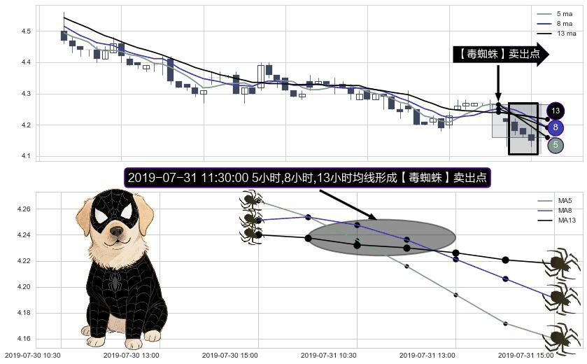形态多维评估: ⚀ 2019-07-31 11:30:00小时显现 5小时-8小时-13小时均线 【毒蜘蛛】卖出点 看空信号,后市看跌,卖出
