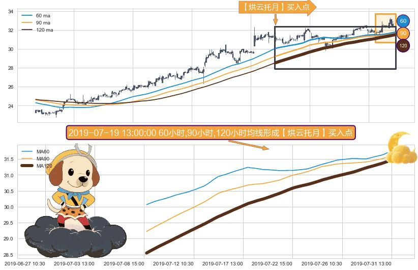 形态多维评估: ⚀ 2019-07-09 09:30:00小时-2019-07-31 15:00:00小时显现 60小时-90小时-120小时均线 【烘云托月】买入点 看多信号,后市看涨,买入