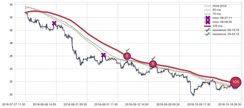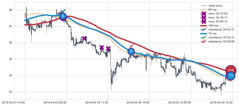 下跌趋势03-21 14:00-05-24 10:30,均线105, 75确认关键阻力2处