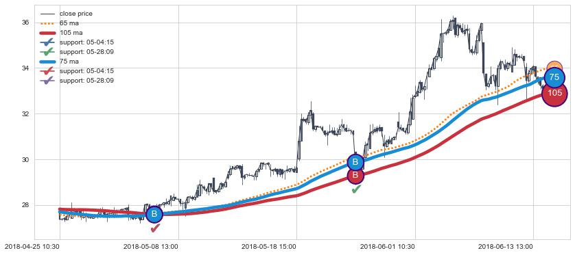 上涨趋势04-25 10:30-06-14 11:30,均线105, 75确认关键支撑2处