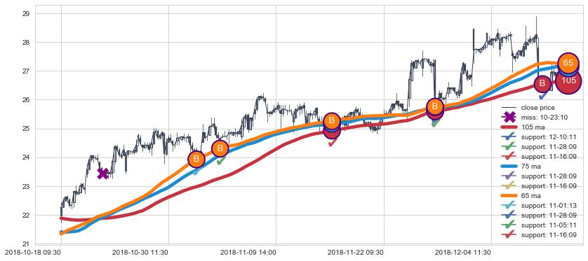 上涨趋势10-18 09:30-12-11 13:00,均线65, 105, 75确认关键支撑5处