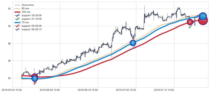 上涨趋势05-24 10:30-07-22 09:30,均线105, 75确认关键支撑3处