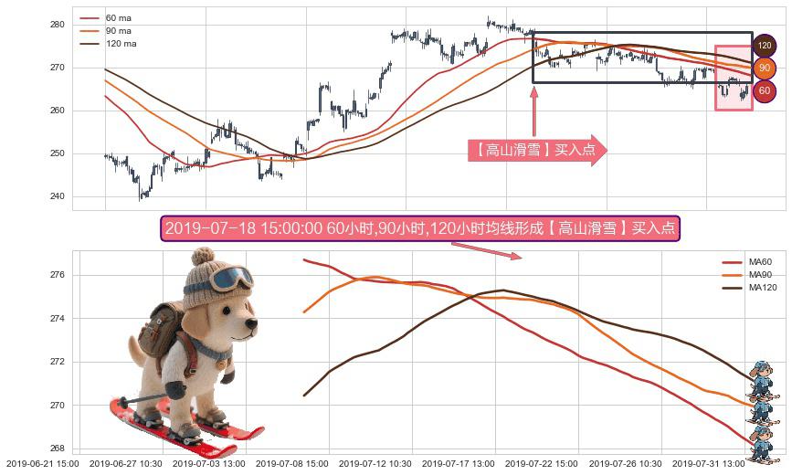 形态多维评估: ⚀ 2019-07-05 15:00:00小时-2019-07-31 15:00:00小时显现 60小时-90小时-120小时均线 【高山滑雪】买入点 看多信号,后市看涨,买入