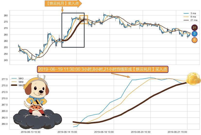 形态多维评估: ⚀ 2019-06-14 14:00:00小时-2019-06-24 09:30:00小时显现 3小时-8小时-21小时均线 【烘云托月】买入点 看多信号,后市看涨,买入