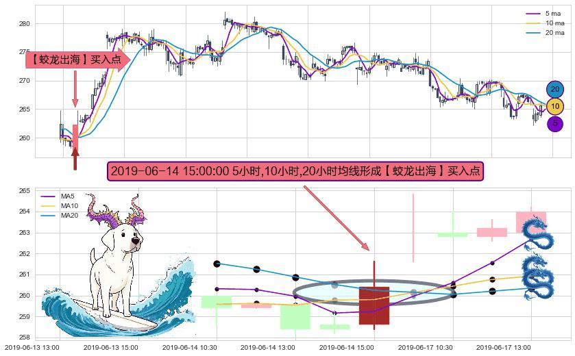 形态多维评估: ⚀ 2019-06-14 15:00:00小时显现 5小时-10小时-20小时均线 【蛟龙出海】买入点 看多信号,后市看涨,买入