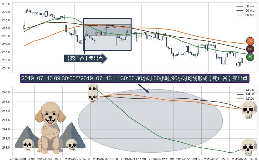 形态多维评估: ⚀ 2019-07-10 10:30:00-小时至2019-07-16 11:30:00-小时显现 30小时-60小时-90小时均线 【死亡谷】卖出点 看空信号,后市看跌,卖出