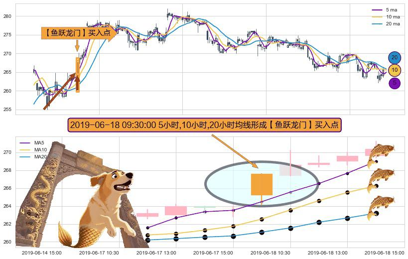 形态多维评估: ⚀ 2019-06-18 09:30:00小时显现 5小时-10小时-20小时均线 【鱼跃龙门】买入点 看多信号,后市看涨,买入