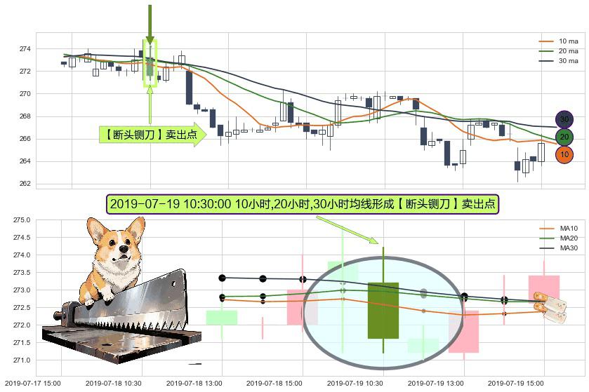 形态多维评估: ⚀ 2019-07-19 10:30:00小时显现 10小时-20小时-30小时均线 【断头铡刀】卖出点 看空信号,后市看跌,卖出