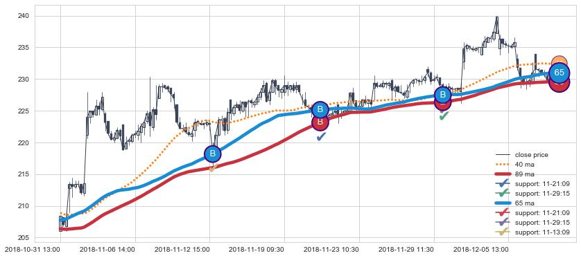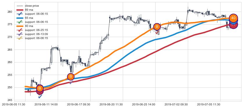 上涨趋势06-05 11:30-07-08 11:30,均线65, 89, 40确认关键支撑3处