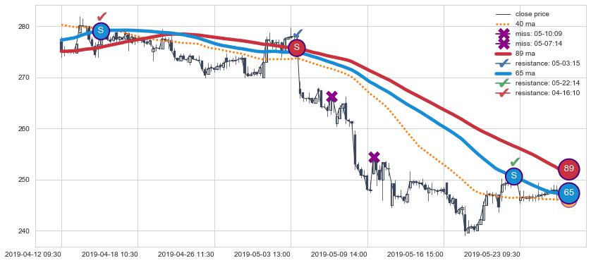 下跌趋势04-12 09:30-05-27 10:30,均线65, 89确认关键阻力3处