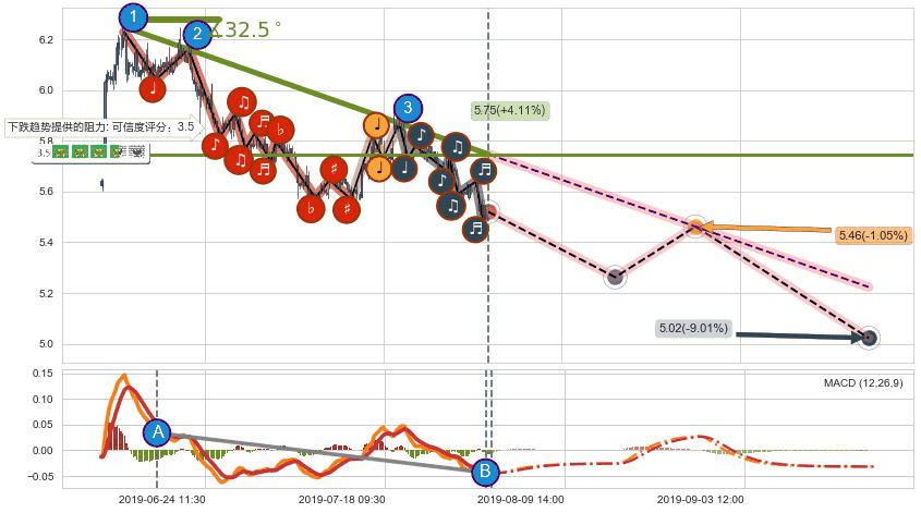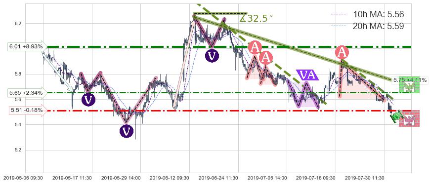 ➣ 预测:2019-08-28 11:00,【试探阻力】稳定目前下跌趋势的前提下,预测价格:5.46