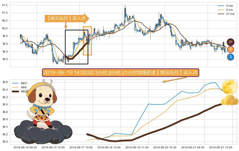 形态多维评估: ⚀ 2019-06-17 13:00:00小时-2019-06-21 14:00:00小时显现 3小时-8小时-21小时均线 【烘云托月】买入点 看多信号,后市看涨,买入
