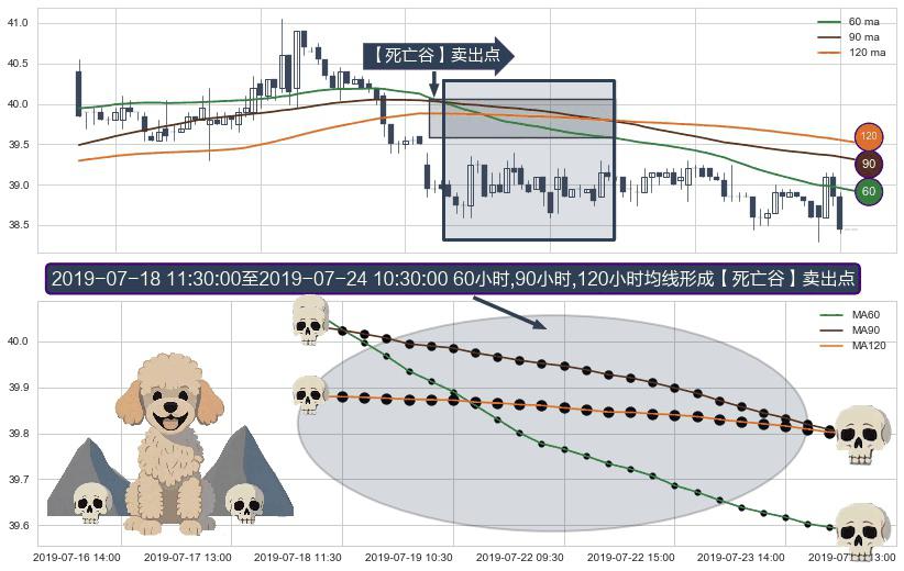 形态多维评估: ⚀ 2019-07-18 13:00:00-小时至2019-07-24 10:30:00-小时显现 60小时-90小时-120小时均线 【死亡谷】卖出点 看空信号,后市看跌,卖出