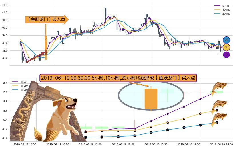形态多维评估: ⚀ 2019-06-19 09:30:00小时显现 5小时-10小时-20小时均线 【鱼跃龙门】买入点 看多信号,后市看涨,买入