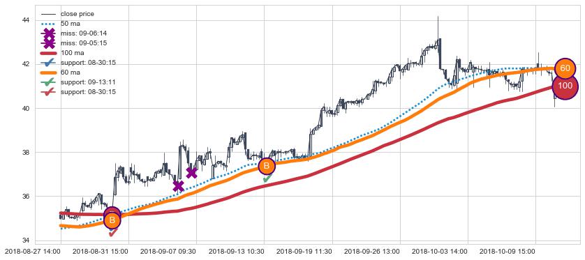 上涨趋势08-27 14:00-10-11 09:30,均线100, 60确认关键支撑2处