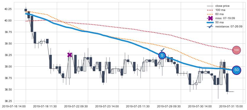 下跌趋势03-08 11:30-05-30 09:30,均线100确认关键阻力3处