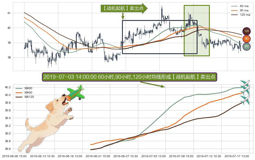 形态多维评估: ⚀ 2019-06-19 13:00:00小时-2019-07-16 14:00:00小时显现 60小时-90小时-120小时均线 【战机起航】卖出点 看空信号,后市看跌,卖出