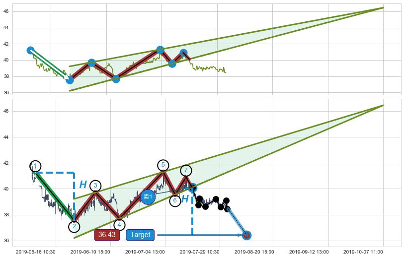| 2 🅚:下跌两颗星 | 下跌三颗星 ➕ 📐:升楔型下行突破支撑位破位, 猜想持续下沉下跌,被突破的支撑位已变为阻力位 ☞ 看空信号 ⇥ 【🅚线】交织【图形】⇥ 综合量化分数: 37 | > |