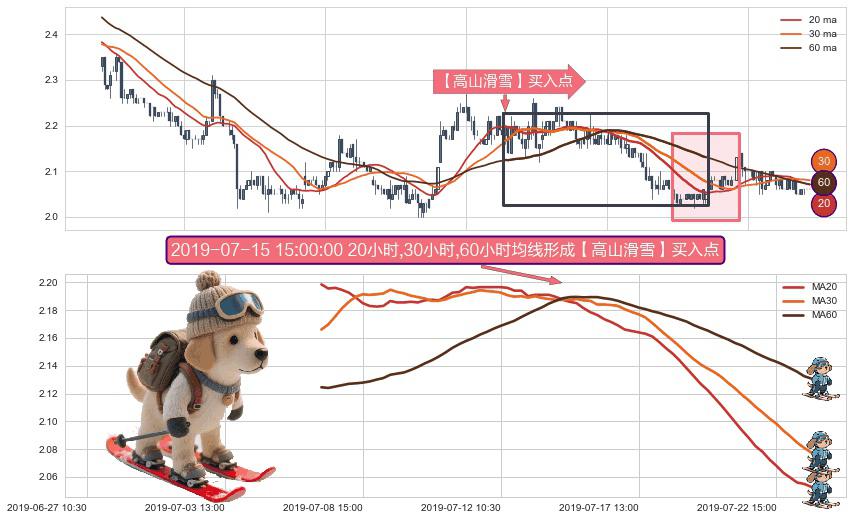 ⚀ 2019-07-05 15:00:00小时-2019-07-23 14:00:00小时显现 20小时-30小时-60小时均线 【高山滑雪】买入点 看多信号,后市看涨,买入