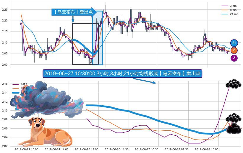 ⚀ 2019-06-25 10:30:00小时-2019-07-02 10:30:00小时显现 3小时-8小时-21小时均线 【乌云密布】卖出点 看空信号,后市看跌,卖出