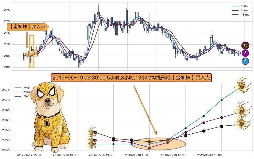 ⚀ 2019-06-19 09:30:00小时显现 5小时-8小时-13小时均线 【金蜘蛛】买入点 看多信号,后市看涨,买入
