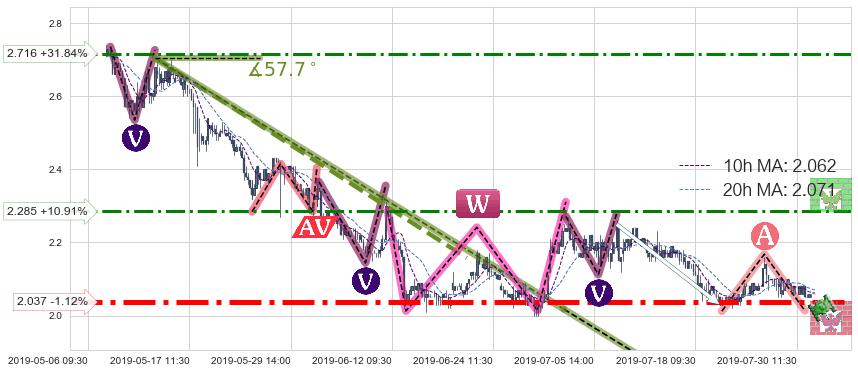 ♘ 阻力价格位2.285,可信任强度59.81%,距离最后交易2019-07-31 15:00形成的收盘价格2.060相差 +10.91%