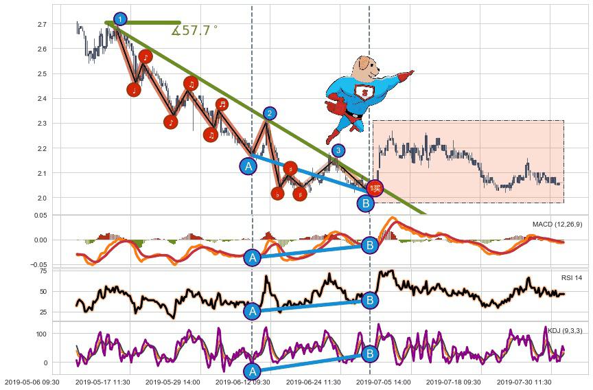 ➢ 最后的下跌趋势2019-05-14 13:00至2019-07-03 10:30:存在突破迹象,后续小反弹或者反转上涨