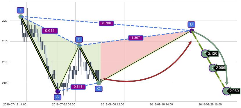 ➢ 距离预测D点位置有足够的上涨空间, 与看跌【伽利】形态相反,实际方向【看涨】