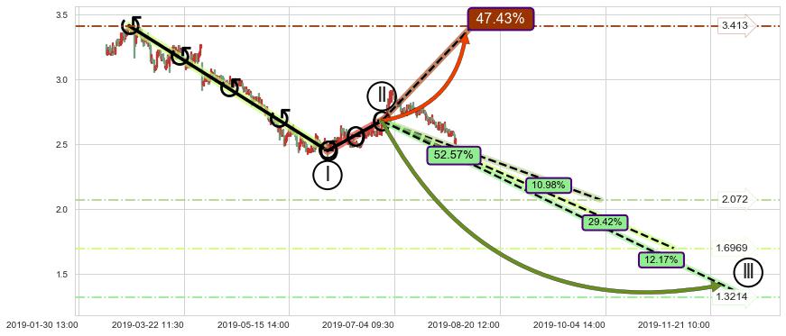 ➣ 调整浪已超过预测的c点位置,后续大趋势循环浪继续下跌概率52.57%,谨慎做多