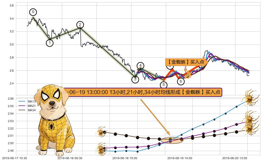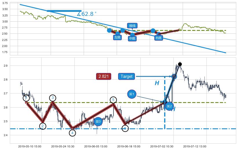 从2019-05-23 14:00至2019-06-13 09:30,共包含81个小时,阶段股价上涨1.60%,阶段股价变动位移路程比: 1 : 23