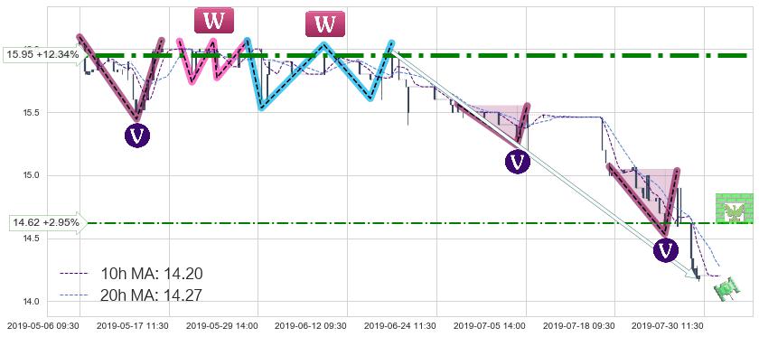 ♘ 阻力价格位15.95,可信任强度89.48%,距离最后交易2019-07-31 15:00形成的收盘价格14.20相差 +12.34%