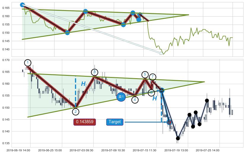 ➢ 最小中继整理跌幅→𝐇: 0.0133750 (低点逐步抬高斜边第一支撑点②与阻力边垂直距离)
