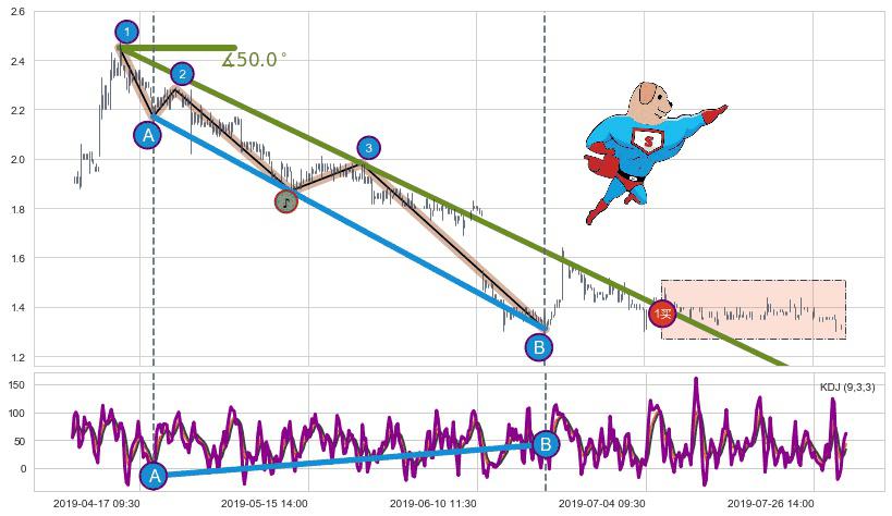 ➣ 【KDJ】下跌趋势出现【常规背离 & 反转信号】背离程度36.31%,背离夹角角度77.9˚,背离程度较小