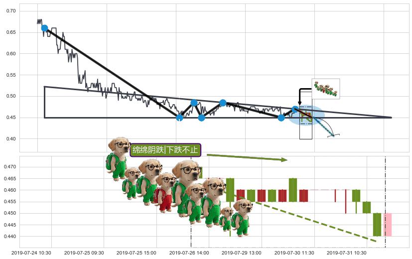 ➣ 【已确认突破】下降三角形整理 起点:04-26:09,突破点:07-31:11,形态共387交易小时