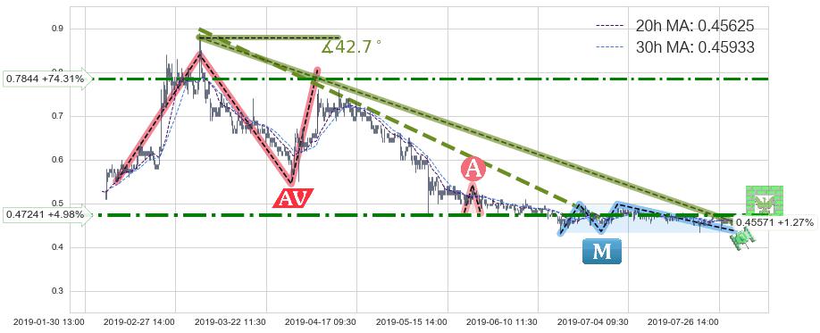 🦴 长线均值回复组合短线趋势跟踪[强阻力信号]2019-03-06 09:30-2019-07-31 15:00下跌趋势依然成立(下跌趋势跟踪依然存在),短线价格略微上行反弹(均值回复猜想),即将接近下跌趋势提供的未破位阻力价格:0.45571。