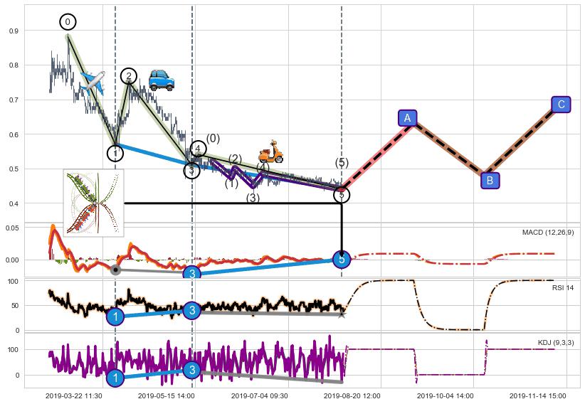 ➣ 1,3,5驱动浪MACD, RSI, KDJ走势都出现【常规背离】反转信号增强