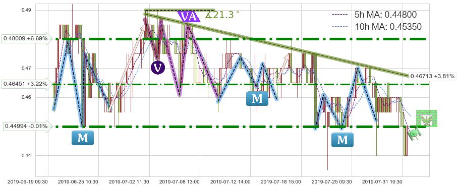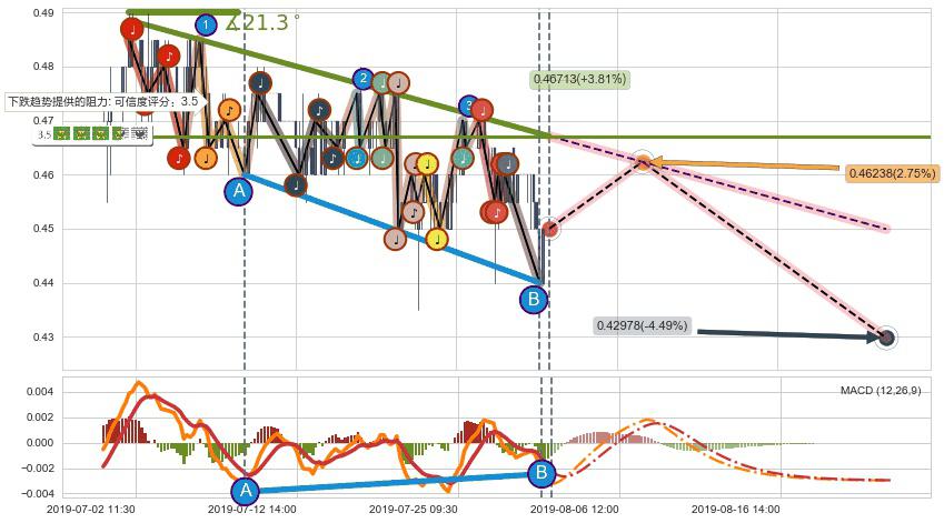 ➢ 预测:2019-08-07 14:00,【小幅反弹】稳定目前下跌趋势的前提下,预测价格:0.46238