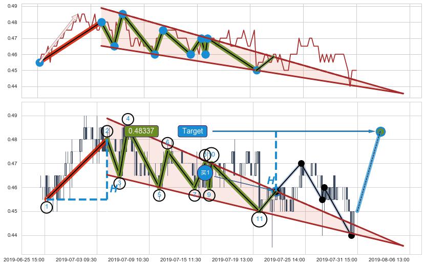 ➢ 最小中继整理涨幅→𝐇: 0.0250000 (𝐇楔型旗杆的长度:楔型起点→顶点)