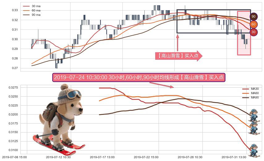 ⚀ 2019-07-16 11:30:00小时-2019-07-31 15:00:00小时显现 30小时-60小时-90小时均线 【高山滑雪】买入点 看多信号,后市看涨,买入