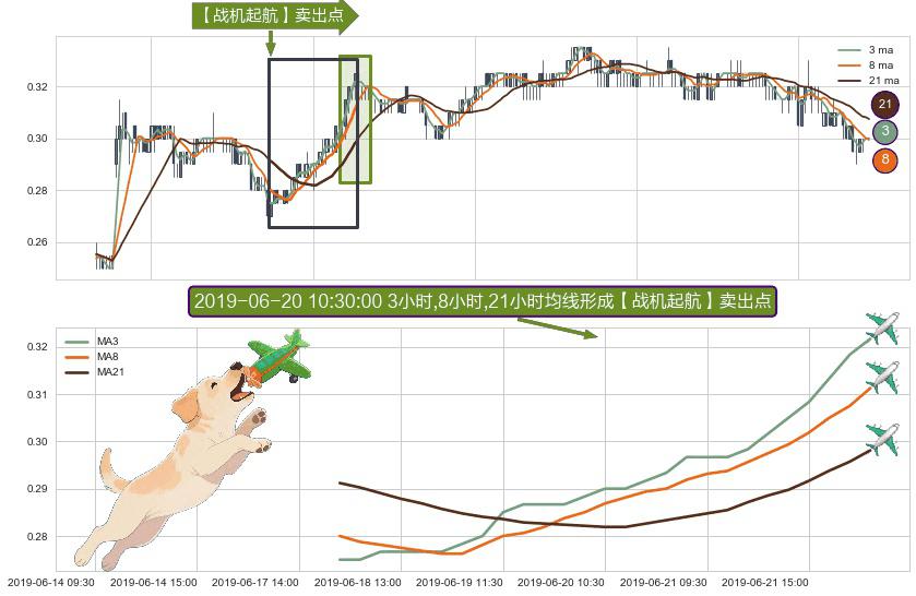 ⚀ 2019-06-18 09:30:00小时-2019-06-24 11:30:00小时显现 3小时-8小时-21小时均线 【战机起航】卖出点 看空信号,后市看跌,卖出