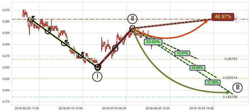 ➣ 调整浪已超过预测的c点位置,后续大趋势循环浪继续下跌概率53.03%,谨慎做多