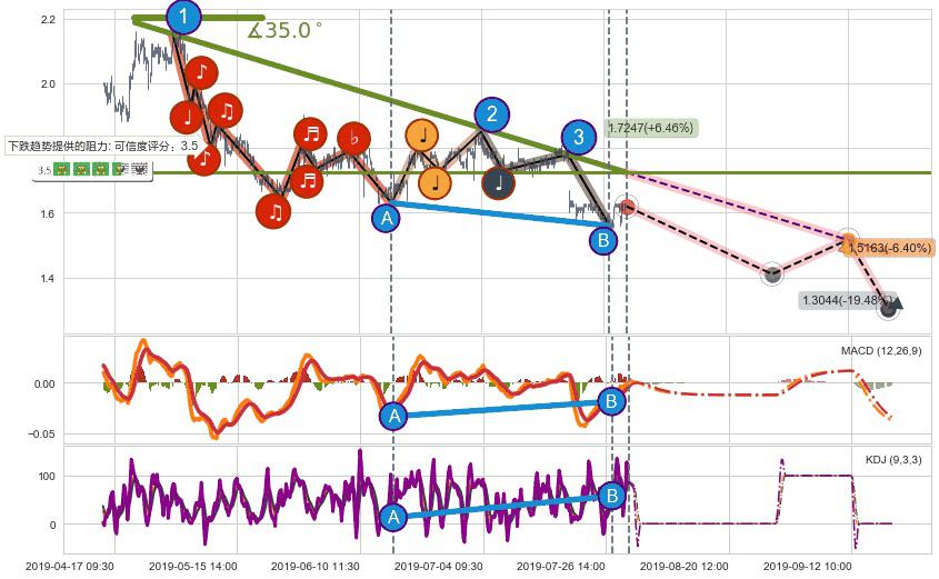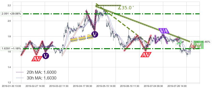 ♘ 在最后的下跌阶段2019-04-23 15:00至2019-07-31 15:00,存在 持续未破位的阻力位 ,阻力价格1.7247,可信任强度77.66%,其距离最后价格1.6200相差 +6.46%