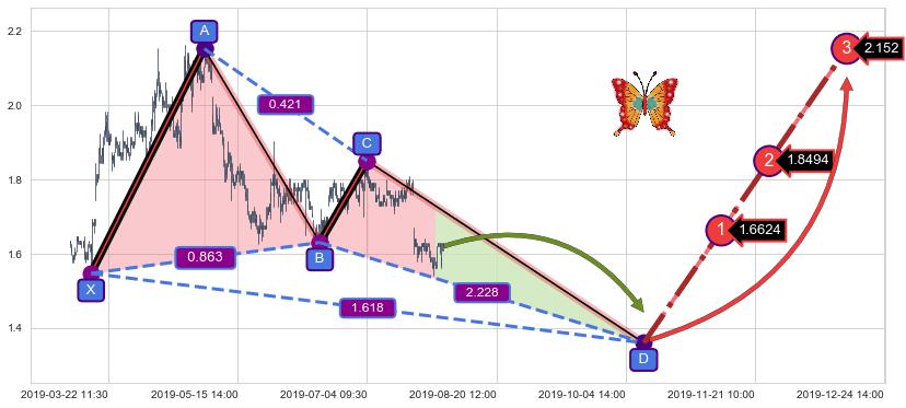 ➢ 距离预测D点位置有足够的下跌空间, 与看涨【蝴蝶】形态相反,实际方向【看跌】