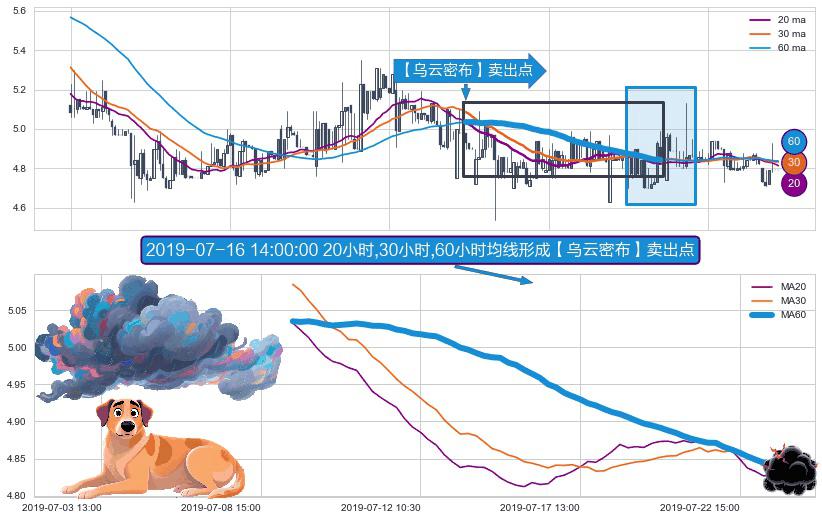 形态多维评估: ⚀ 2019-07-09 13:00:00小时-2019-07-23 14:00:00小时显现 20小时-30小时-60小时均线 【乌云密布】卖出点 看空信号,后市看跌,卖出